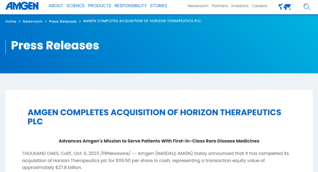 10月6 日,安进宣布以每股116.50 美元现金正式完成对Horizon的收购,交易股权价值约为 278 亿美元。此前,两家公司于2022年12月披露收购消息,作为2022年医药行业最大的收购案,终于落定。