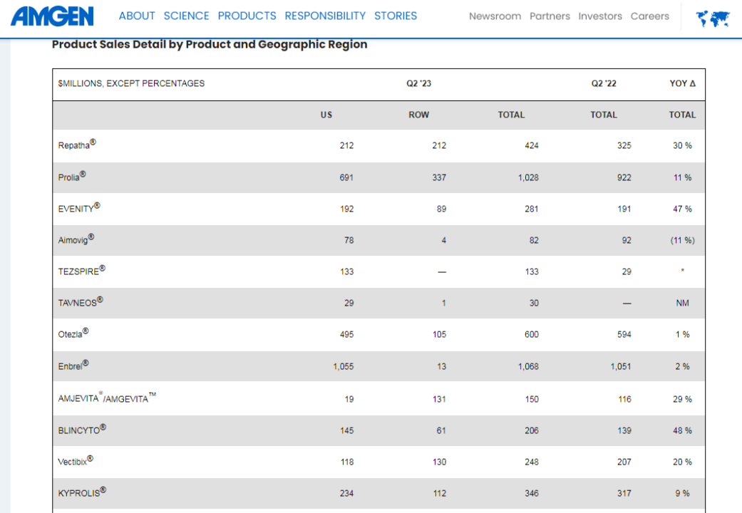 安进预计2023年的营收规模将在260亿美元至272亿美元之间,而分析师普遍预期则为271.7亿美元,营收展望勉强位于预期内。今年8月,安进公布2023年第二季度业绩。季度总营收69.86亿美元,上年同期为65.94亿美元。9款药物季度销售额突破历史新高,其中Prolia季度销售首次达到10亿美元,但Enbrel第二季度同比只增长了增长2%,而Aimovig因降价第二季度销售额同比下降11%。