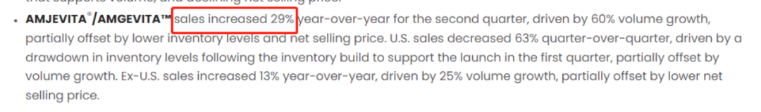 安进公司的 Amjevita 在美国第一季度的销售额达到了5100 万美元,而在全球其他地区的销售额为1.13亿美元,全球总销售额达到了1.64亿美元,同比增长52%。安进公司全球商业运营执行副总裁 Murdo Gordon 在公司第一季度财报电话会议上表示,由于 Amjevita 在美国第一季度的销售额大部分用于预定库存,他预测第二季度的销售收入可能会有所下降。最终Amjevita 第二季度销售额同比为29%。
