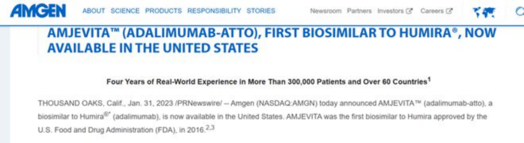 回到产品营收上,安进的生物类似药赛道引擎轰鸣。1月31日,安进宣布其研发的Amjevita正式进入美国市场。Amjevita是阿达木单抗(Humira,修美乐)的生物类似药,同时也是FDA批准的首个阿达木单抗的生物类似药。作为美国首个获批上市的阿达木单抗生物类似药,Amjevita将拥有7个月的独家销售权。