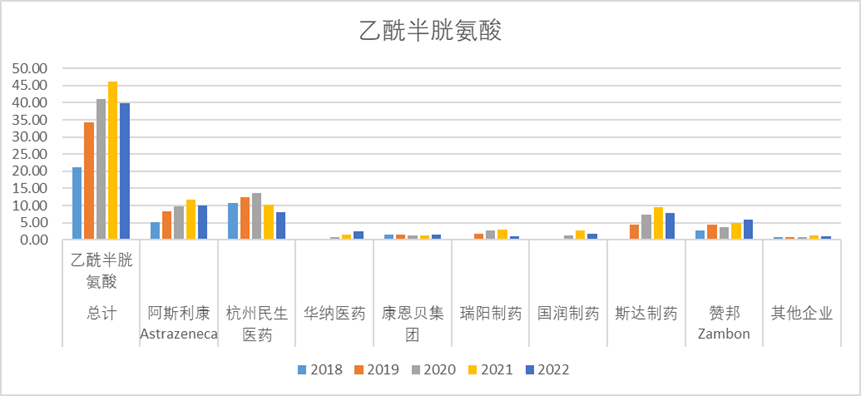 乙酰半胱氨酸2022年销售额39.81亿,其中近几年销售额峰值大概约46亿,其中阿斯利康、杭州民生医药销售额占比较高,这两企业的销售额都在10亿左右,其次是斯达制药和赞邦,销售额在5-10亿左右。