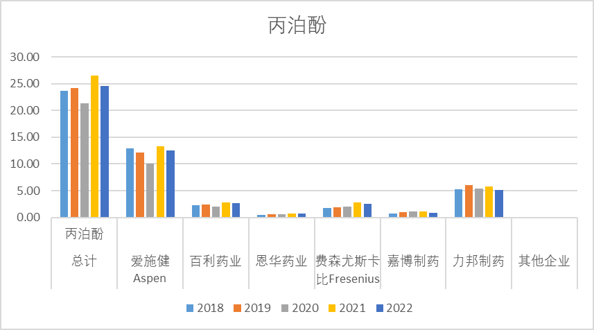 丙泊酚2022年销售额24.54亿,其中近几年销售额峰值大概约25亿,其中爱施健、力邦制药的销售额较高,而爱施健超10亿,力邦制药在5亿左右,其他企业相对较小。