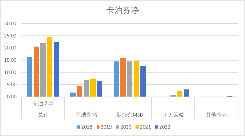 卡泊芬净2022年销售额22.47亿,其中近几年销售额峰值大概约25亿,整体呈现两强局面,默沙东和恒瑞医药是绝对龙头,默沙东销售额接近15亿,恒瑞医药在5-10亿,正大天晴也逐渐开始放量。