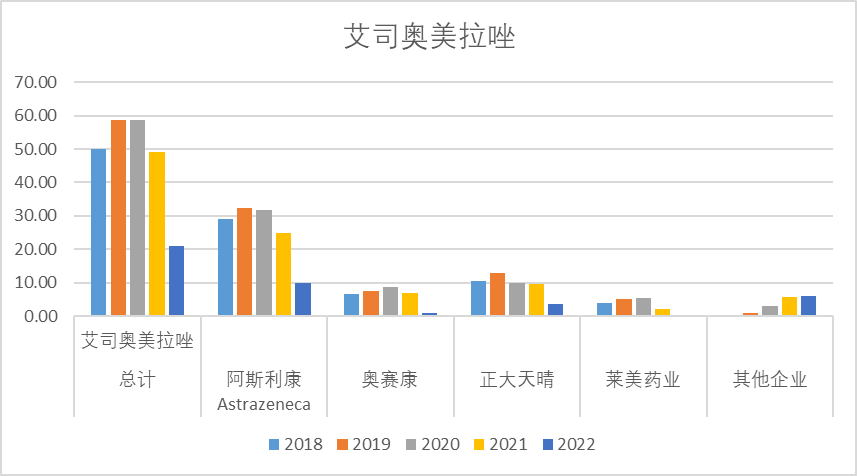 艾司奥美拉唑2022年销售额21.00亿,其中近几年销售额峰值大概约60亿,其中阿斯利康是绝对龙头,但近几年销售额逐年下降,目前阿斯利康的销售额在10亿左右,其他如奥赛康、正大天晴、莱美药业也类似。