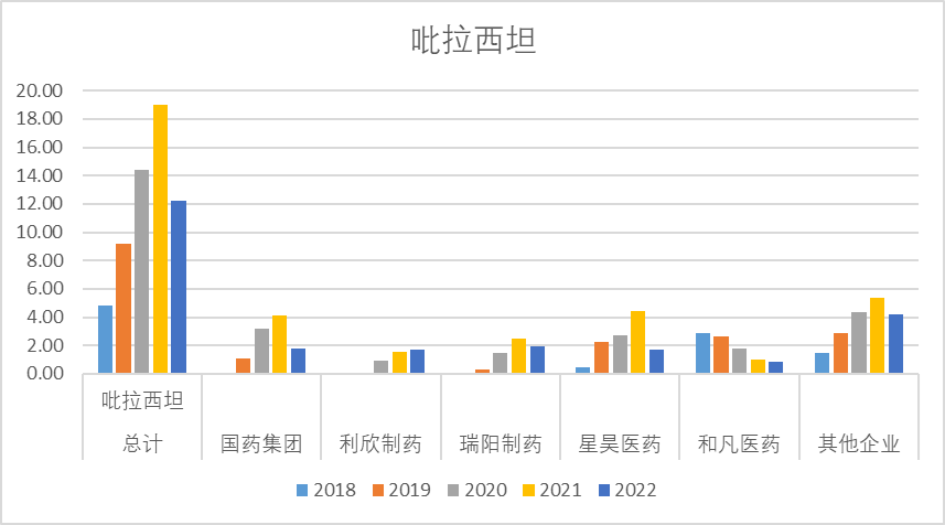 吡拉西坦2022年销售额12.19亿,其中近几年销售额峰值大概约20亿,整体格局都比较分散,国药集团、星昊医药、和凡医药等公司的销售额相差不大。