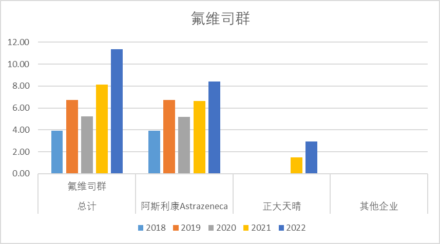 氟维司群2022年销售额11.36亿,其中近几年销售额峰值大概约12亿,基本只有2家企业,阿斯利康和正大天晴,阿斯利康是绝对的龙头。