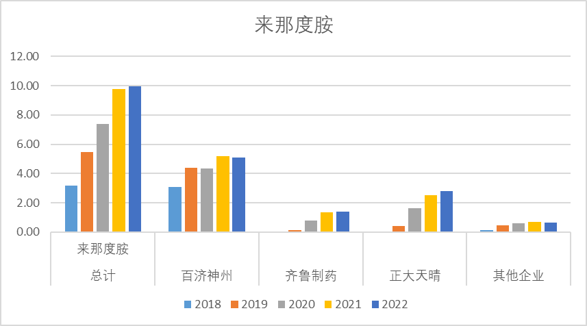 来那度胺2022年销售额9.95亿,其中近几年销售额峰值大概约10亿,主要参与者是百济神州,其次是正大天晴和齐鲁制药,百济神州的销售额约5亿。