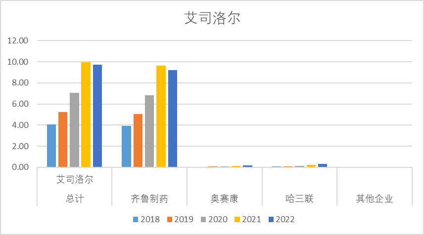 艾司洛尔2022年销售额9.70亿,其中近几年销售额峰值大概约10亿,以齐鲁制药这一家企业为核心,其他公司销售额都非常小。