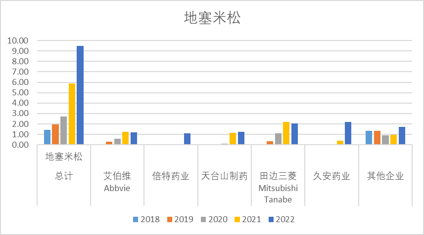 地塞米松2022年销售额9.48亿,其中近几年销售额峰值大概约10亿,整体格局比较分散。