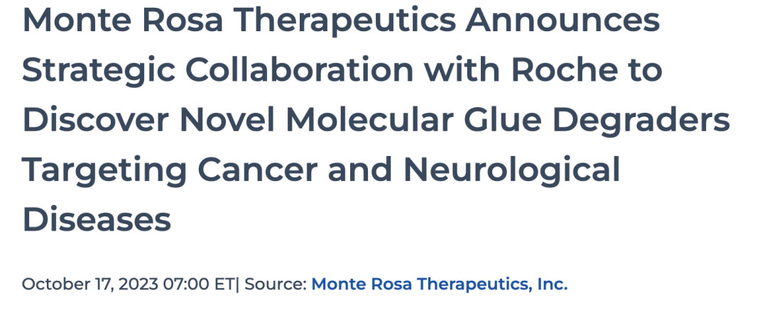10月17日,Monte Rosa宣布与罗氏达成新型分子胶降解剂合作,用于治疗癌症和神经疾病。