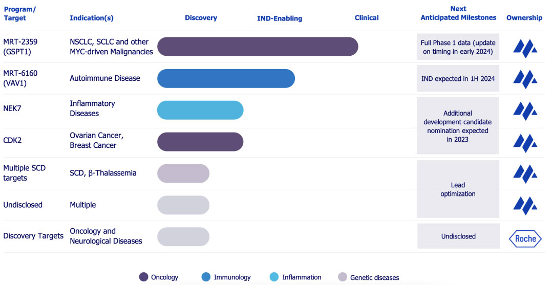其QuEEN™(定量和工程消除新基质)发现引擎结合了人工智能引导的化学、多样化的化学库、结构生物学和蛋白质组学,以确定可降解的蛋白质靶点,并合理地设计出具有选择性的 MGDs。QuEEN发现引擎能够在多个治疗领域获得广泛的、差异化的、经过生物学验证的靶点。目前Monte Rosa 开发的产品线涉及肿瘤、自身免疫和炎症疾病等多个领域。