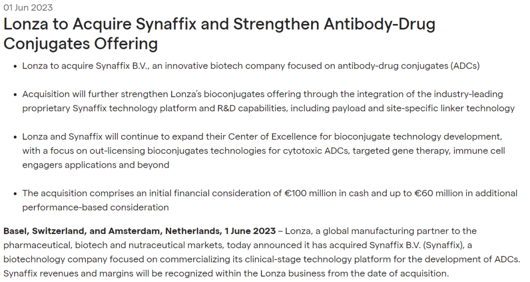 2023年6月1日,CDMO龙头企业Lonza宣布与Synaffix达成收购协议,以进一步增强ADC领域的服务能力。Lonza支付1亿欧元现金,以及基于表现的额外6000万欧元付款。
