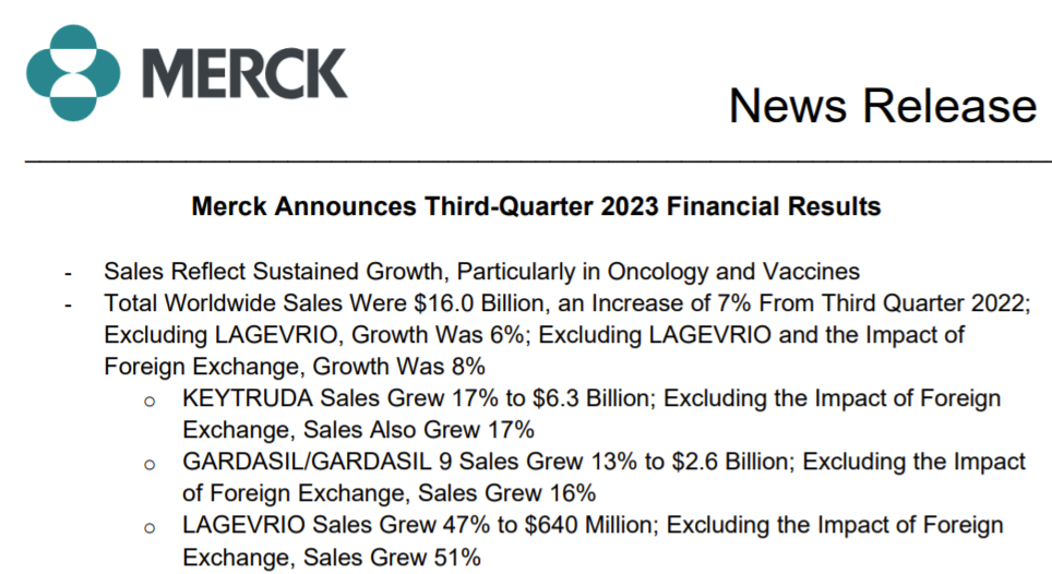 2023年10月26日,默沙东发布三季度财报,三季度营收159.62亿美元,同比增长7%。