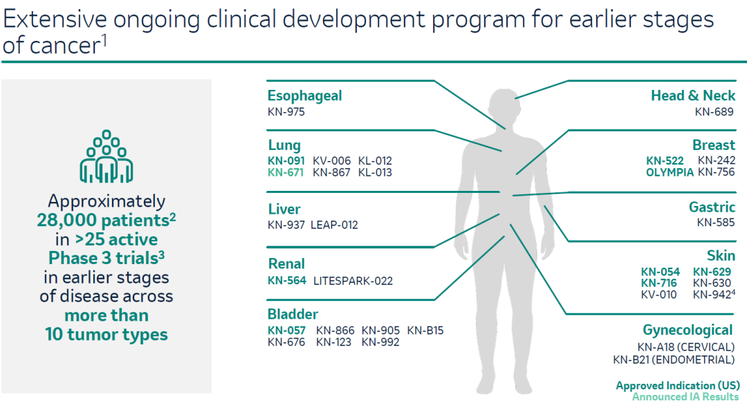 Keytruda在联合治疗方面走的是PD-1+化疗的路线,取得诸多临床突破,同时从后线治疗逐步向前线治疗拓展,目前有25项早期治疗的三期临床在进行中,合计入组大约28000例患者。