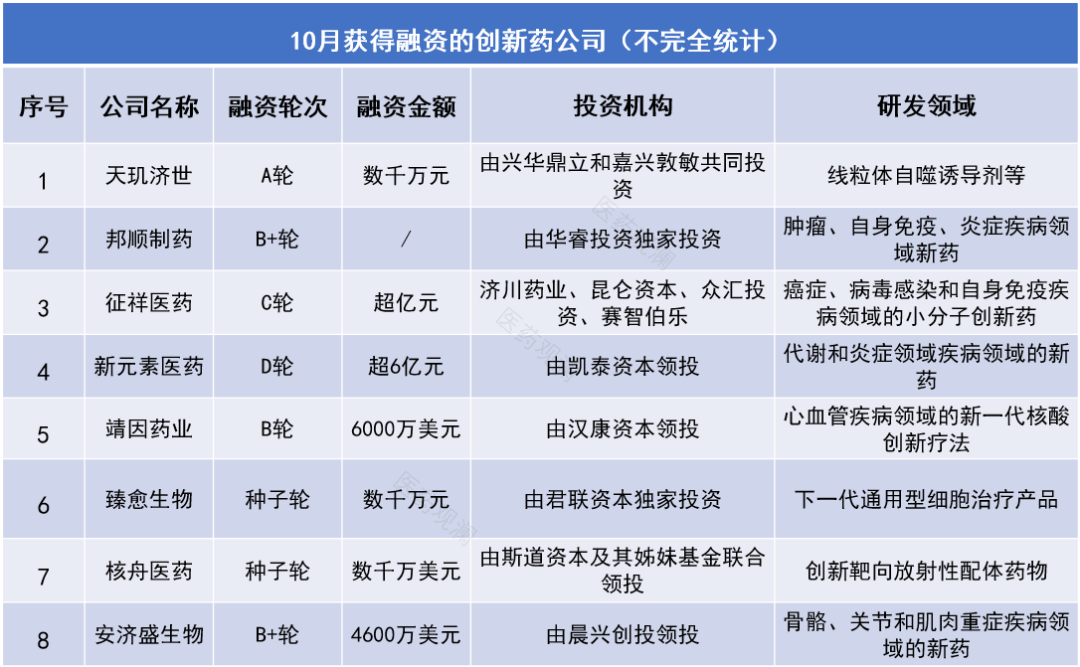 除了上述公司,还有其它生物医药公司也在今年10月宣布完成融资,限于篇幅,本文不再一一介绍。希望在资本的助力下,这些生物医药公司可以加快候选药物的研发进度,早日为广大患者带来新的治疗选择。