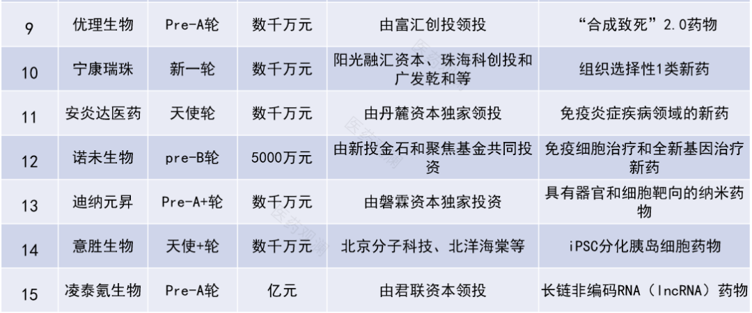 从融资金额来看,披露金额且超1亿元人民币的有5家,其中新元素医药获得超6亿元融资。