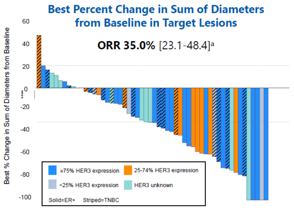 今年ASCO大会的口头报告中,第一三共进一步公布了HER3-Dxd治疗HER2阴性转移性乳腺癌(MBC)患者的2期研究的Part A结果:整体人群的总缓解率(ORR)为35%,临床获益率(CBR)为48%,中位缓解持续时间(DOR)为10.0个月,6个月PFS率为60%(图4)[2]。