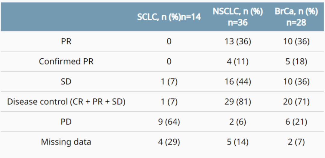 截至 2022 年 11 月 18 日,共招募了 78 名患者(小细胞肺癌 n=14;非小细胞肺癌 n=36;乳腺癌 n=28)。