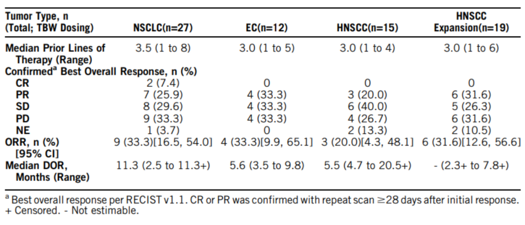 今年ASCO会议上,Antoine等人公布了SGN-B6A的一项1期临床试验结果(NCT04389632)。截至2022年12月14日,148名患者接受了SGN-B6A治疗,A部分88名患者和B部分60名患者,A部分的注册已完成。SGN-B6A显示出可控的安全性,并在大量预处理人群中显示出令人鼓舞的初步抗肿瘤活性和剂量递增的反应持久性(图12)。NSCLC、食管鳞状细胞癌(ESCC)和HNSCC的B部分剂量扩展队列正在进行中[10]。