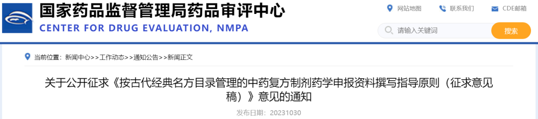 为贯彻落实《中共中央 国务院关于促进中医药传承创新发展的意见》,加快按古代经典名方目录管理的中药复方制剂的研发和申报,药审中心起草了《按古代经典名方目录管理的中药复方制剂药学申报资料撰写指导原则(征求意见稿)》。经征求中心内部相关专业以及专家意见,形成征求意见稿。现在中心网站予以公示,以广泛听取各界意见和建议。我们诚挚地欢迎社会各界对征求意见稿提出宝贵意见和建议,并及时反馈给我们,以便后续完善。征求意见时限为自发布之日起一个月。您的反馈意见请发到邮箱:zyyxzdyz@cde.org.cn (邮箱名为“中药药学指导原则”拼音首字母),并在标题中注明“中药3.1资料撰写”。感谢您的参与和大力支持。