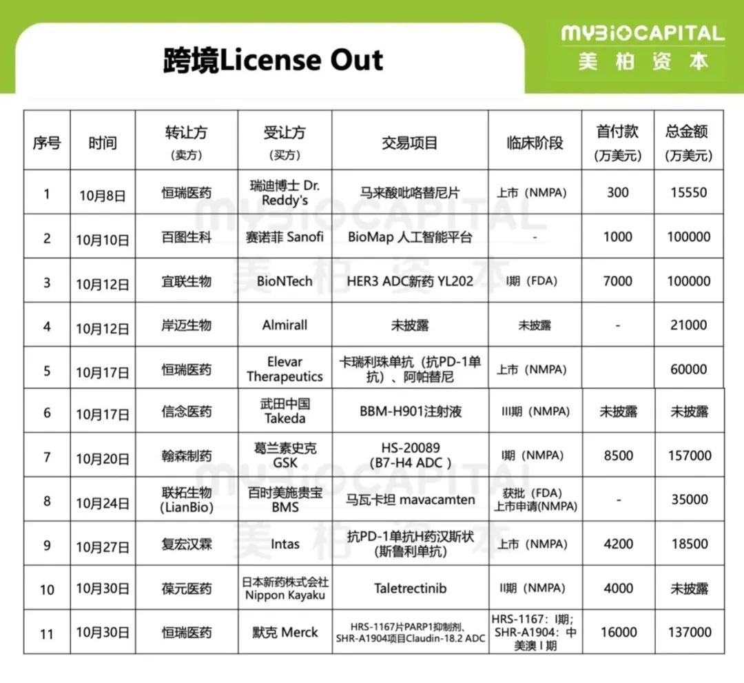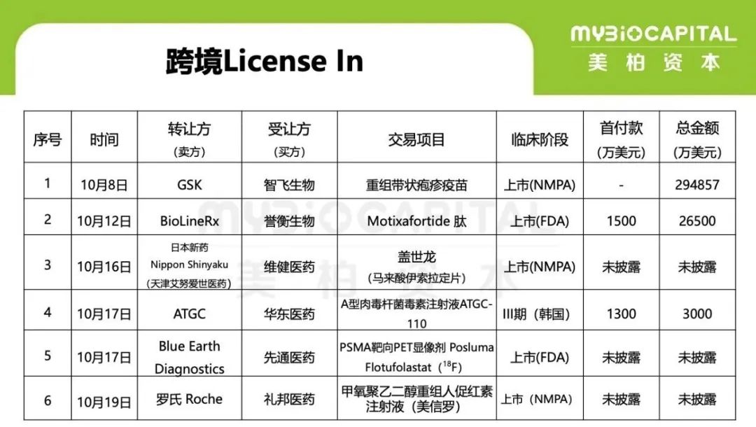 10 月 12 日,纳斯达克上市公司 BioLineRx 宣布与广州誉衡生物科技有限公司(Gloria Biosciences)及相关投资方就在亚洲开发 Motixafortide 肽的所有适应症达成独家许可协议。据悉,根据该许可协议,BioLineRx 公司将收到 1500 万美元的预付款(已在交易完成时收到)、在中国和日本最高达 5000 万美元的潜在开发和监管里程碑付款,以及根据确定的销售目标最高达 2 亿美元的潜在商业里程碑付款。BioLineRx 还有资格从净销售额中获得两位数的分级特许权使用费。