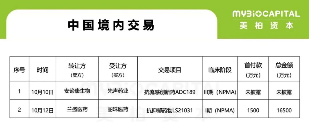 10月12日,丽珠医药与苏州兰晟医药——一家专注于研发中枢神经系统领域创新药物的生物技术公司,就兰晟医药开发的LS21031签署了一项在大中华区的专利及技术转让协议。LS21031是兰晟医药自主研发的一款创新高选择性磷酸二酯酶4D(PDE4D)变构调节剂,已于2023年3月在中国获批临床,适应症为抑郁症。本协议生效后,丽珠制药厂应向兰晟医药支付技术转让费用总额最高不超过16,500.00 万元人民币(包括1500万元首付款、7000万元开发里程碑金和8000万元销售里程碑金)。