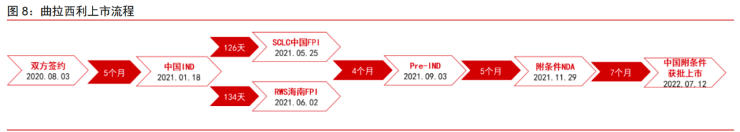 曲拉西利的快速上市,正是先声临床实力和市场准入能力的综合体现。2022年7月12日,曲拉西利(科赛拉)在中国附条件获批,距离美国首次上市仅仅17个月,开发速度在业界遥遥领先。据统计,2019-2021年,在中国交易总金额前100位的合作引进创新药产品中,曲拉西利上市开发速度位列第一。