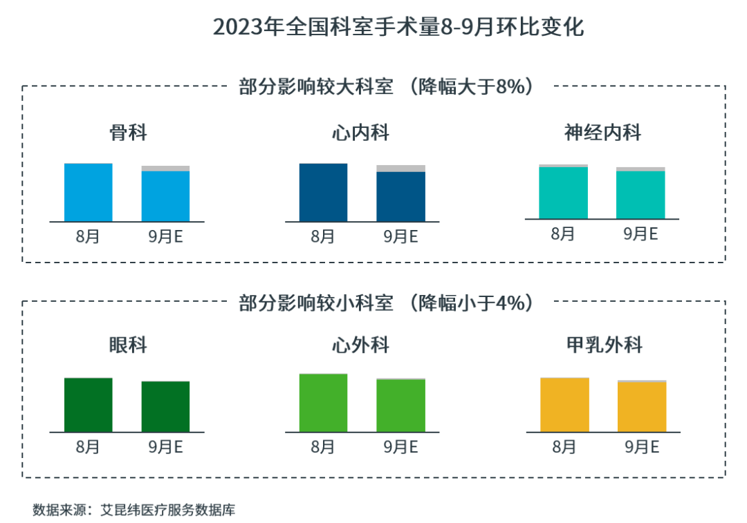 骨科、心内科、神经内科均有产品大范围带量采购。随着未中标产品使用受限,手术相关检查和治疗的耗材及设备使用收紧,医生对手术开展的积极性有一定下降。而以民营医院为主的眼科手术,相对影响小,但人工晶体手术仍有部分受限。而带采不集中的科室(如心外科,甲乳外科等),手术量同样也较少受到影响。