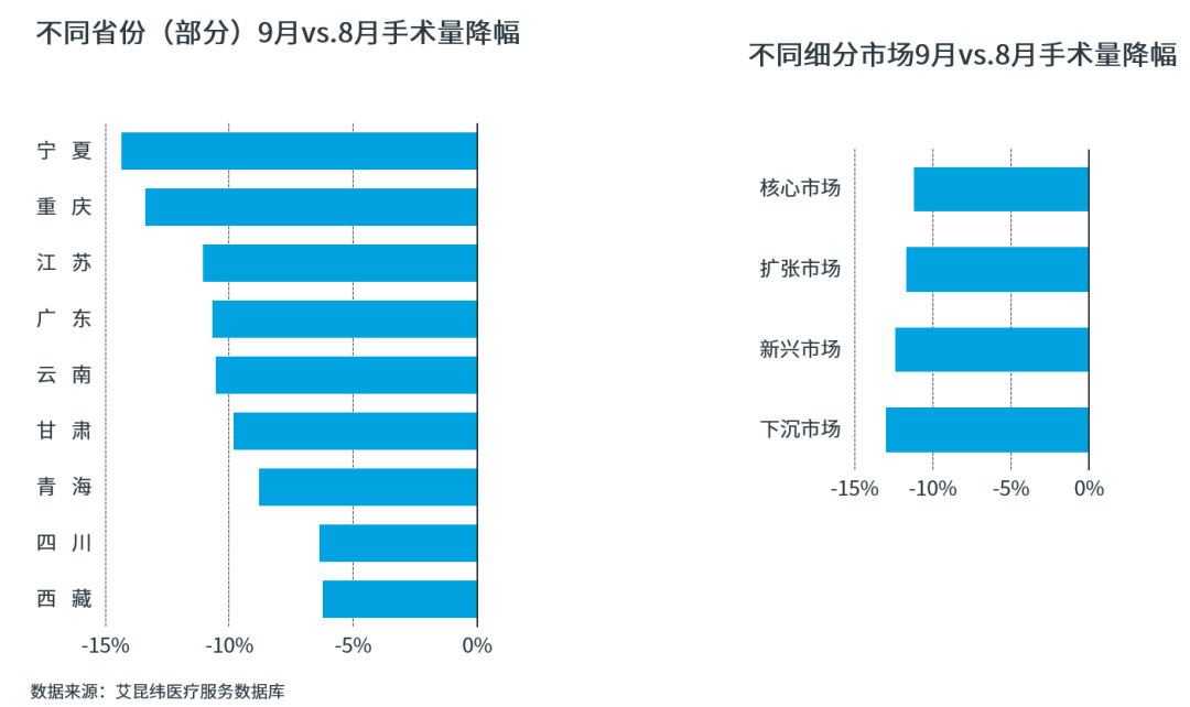各细分市场均不同程度受到合规进程影响。9月影响已逐步扩展到新兴市场和下沉市场。而核心市场和扩张市场前期影响更为严重,目前手术量下降开始放缓。