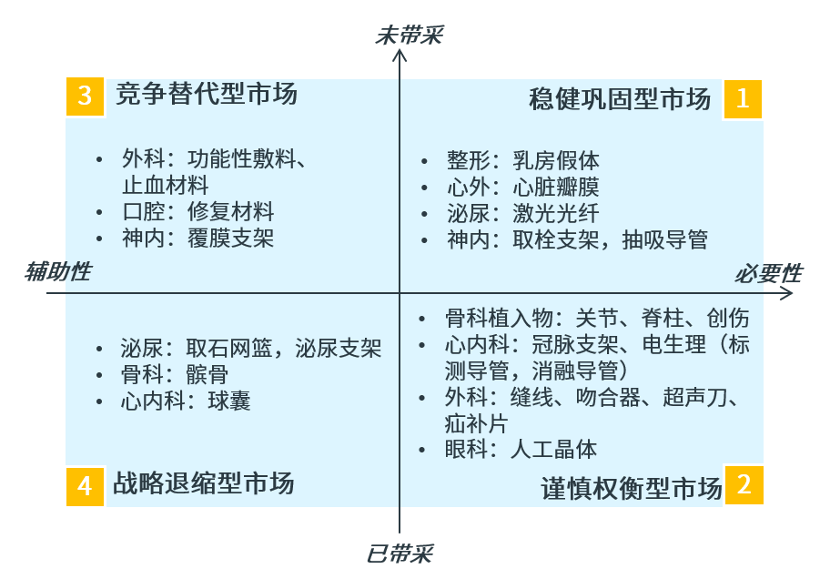 对于战略退缩市场(带采且必要性低的产品),医生使用决策主要取决于整体费用。企业需对高价术式和低价术式做不同推广策略。