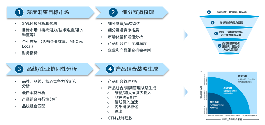 产品衍生组合的布局:外科、骨科、心血管等领域均有较多通过产品组合生命周期管理应对复杂宏观环境的成功案例。生命周期加快后,单产品线越来越难生存。除现有产品的分级化管理外,还需要思考通过国外引进新产品,收并购,自主研发等手段做好更长远的布局全生命周期管理。