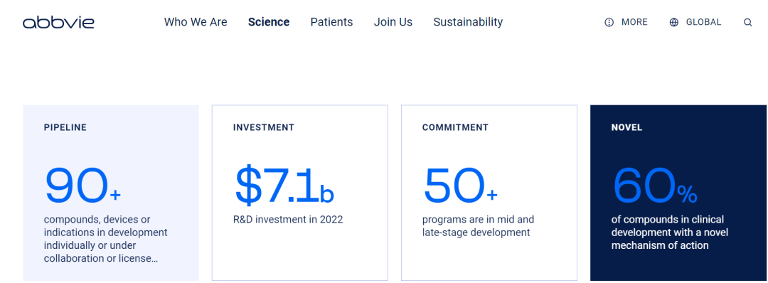 艾伯维官网显示,当前艾伯维共有管线90余条,其中50余条处于中后期研究阶段,60%的化合物具有新的作用机制,同时2022年投入研发71亿美元。