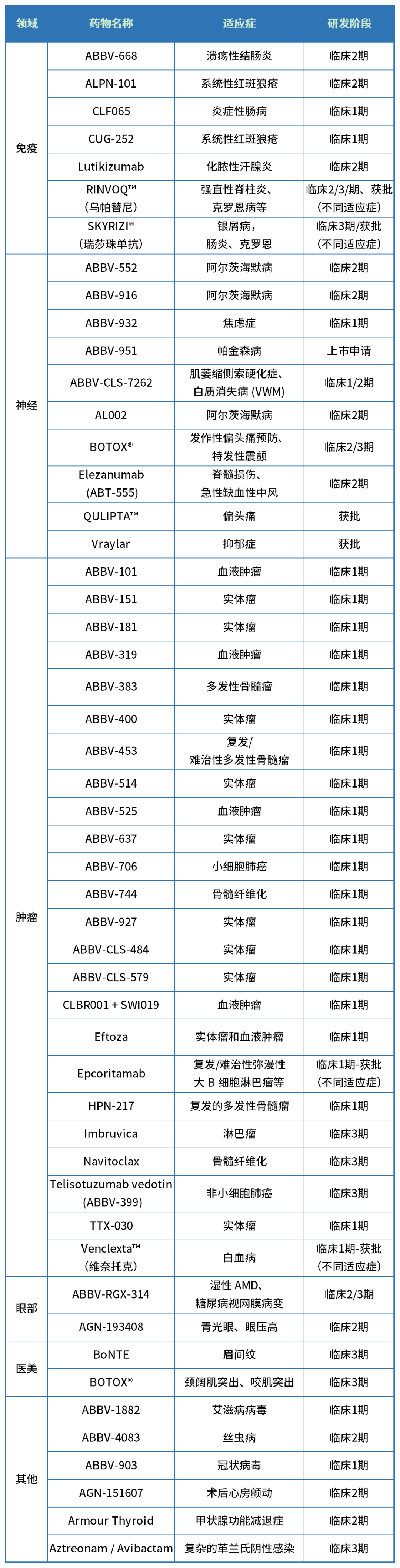如今药王修美乐专利到期,后续市场将继续被蚕食,销售额将大幅下降。好在继任者瑞莎珠单抗表现良好,有望重现修美乐当年的风采。同时艾伯维管线众多,涉及免疫、神经、肿瘤等多个领域,丰富的管线也成为了艾伯维规避风险的重要手段。
