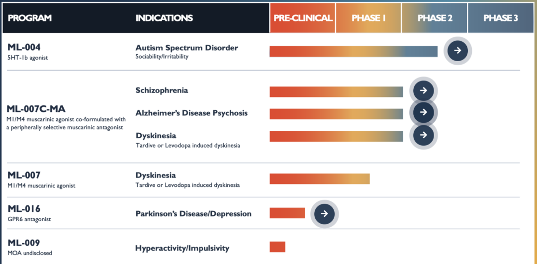 除了ML-007C-MA之外,MapLight公司目前还有两种产品处于临床开发阶段:ML-007是一种毒蕈碱受体激动剂,用于靶向M1和M4毒蕈碱受体亚型,正在研究用于治疗运动障碍;ML-004是一种5HT-1b激动剂,目前正处于治疗自闭症谱系障碍患者社会交流障碍的2期临床试验中。此外,MapLight的临床前产品还包括ML-016和ML-009,前者是一种GPR-6拮抗剂,正在研究用于治疗帕金森病和抑郁症,后者正在开发用于治疗多动症和冲动行为。