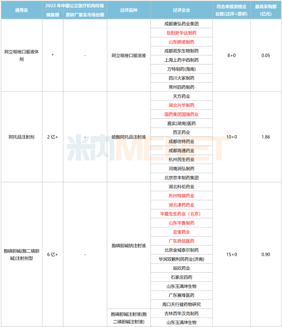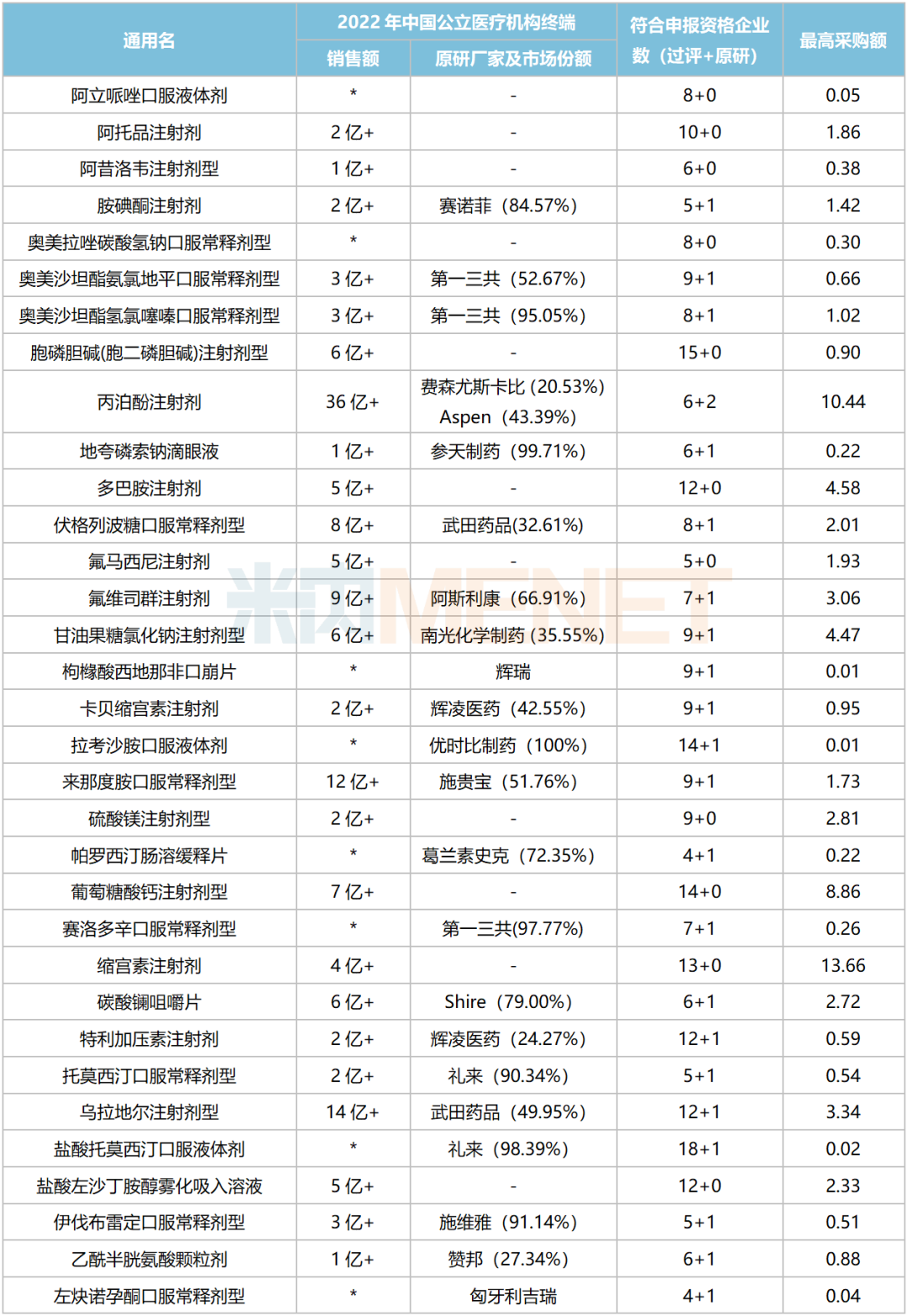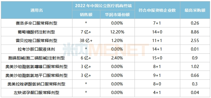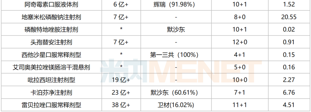 注:销售额不分规格,低于1亿元用*代表;最高采购额以首年约定采购量*最高有效申报价计;过评企业含上市许可持有人等