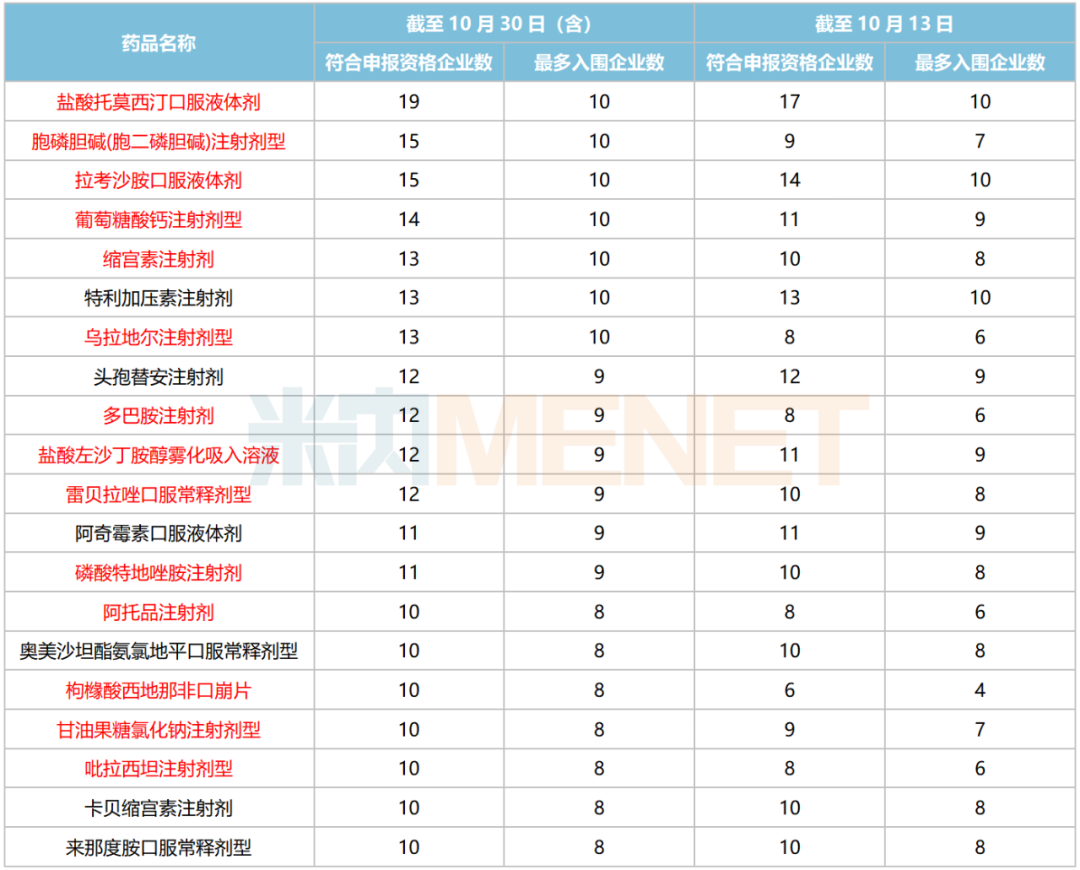 以审评结论日期统计,与正式文件发布时(10月13日)相比,第九批集采符合申报资格企业数≥10家的品种增加7个至20个,包括乌拉地尔注射剂、多巴胺注射剂、阿托品注射剂、胞磷胆碱(胞二磷胆碱)注射剂型、甘油果糖氯化钠注射剂型、枸橼酸西地那非口崩片及吡拉西坦注射剂型。