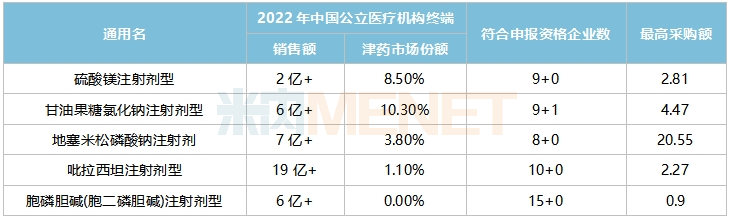 胞磷胆碱(胞二磷胆碱)注射剂新增过评企业数最多,达6家,分别为苏州特瑞药业、湖北津药药业、华夏生生药业、山东华鲁制药、亚宝药业及广东鼎信医药,符合申报资格企业数由9家增加至15家,最多入围企业数由7家增加至10家。这是一种核苷衍生物,具有改善脑循环、促进大脑功能恢复等作用,2022年在中国城市公立医院、县级公立医院、城市社区中心以及乡镇卫生院(简称中国公立医疗机构)终端的销售额超过6亿元,中嘉生物(未过评)以超30%的市场份额领跑,山东华鲁制药(已过评)、广东鼎信医药(已过评)等紧接其后。