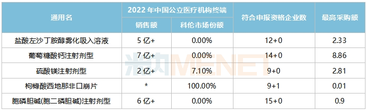 科伦药业新过评1个品种,为硫酸镁注射剂型,公司2022年在盐酸左沙丁胺醇雾化吸入溶液、葡萄糖酸钙注射剂型、胞磷胆碱(胞二磷胆碱)注射剂型等品种所占份额均为0,其中葡萄糖酸钙注射剂型最高采购额超过8亿元。