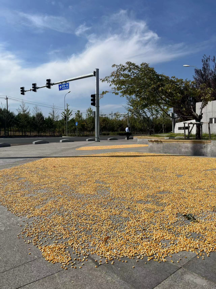 2023年的秋天,北方某地一线城市的经济技术开发区路边,空旷的水泥地上晾晒着一大片金黄色玉米粒。