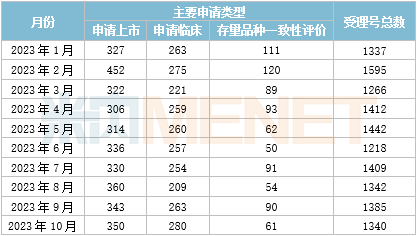 据米内网中国申报进度(MED)数据库统计,2023年10月CDE共承办药品注册申请1340件。其中上市申请350件,临床申请280件,存量品种一致性评价61件。