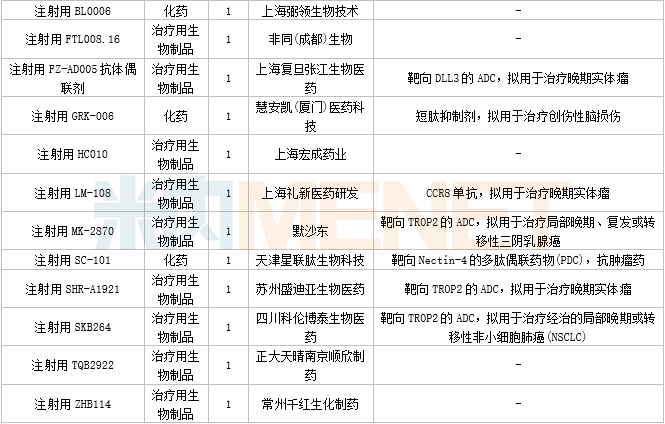 2023年10月,136个创新药品种(药品注册分类为“1”的品种)获CDE承办。有6个1类新药申请上市,其中化药有5个,治疗用生物制品有1个。此外还有9个ADC药物申请临床:DS-1062a、DS-6000a、IBI343、注射用AMT-707、注射用BB-1710、注射用FZ-AD005抗体偶联剂、注射用MK-2870、注射用SHR-A1921、注射用SKB264。