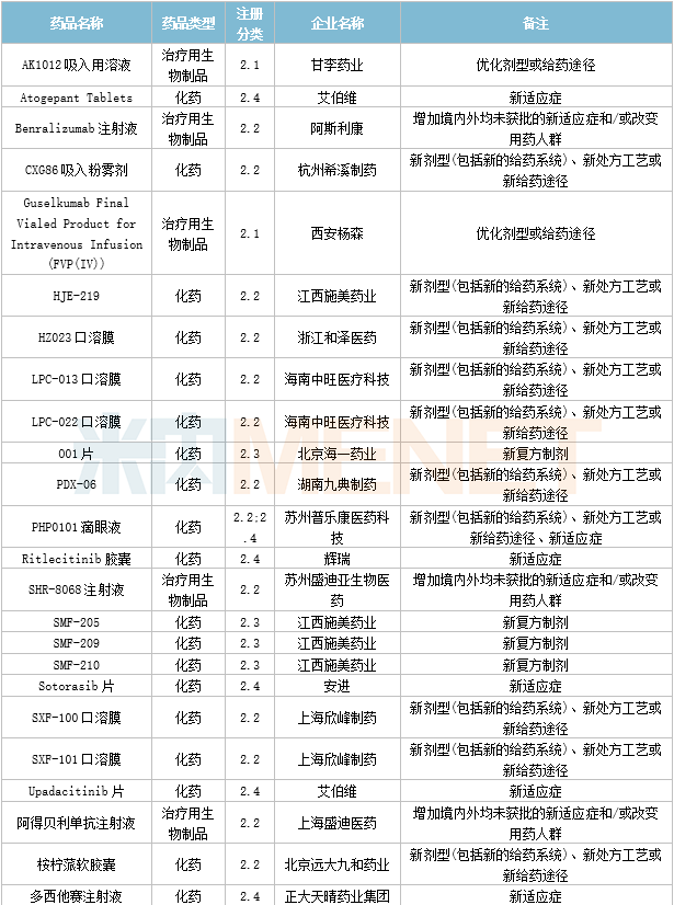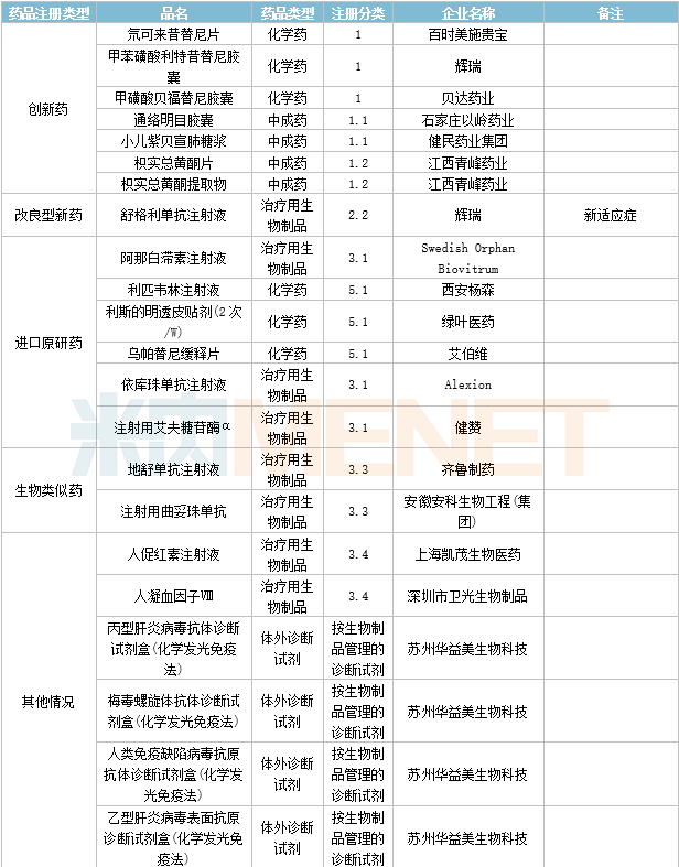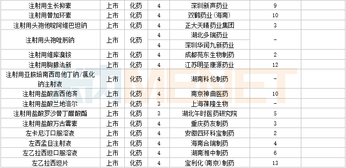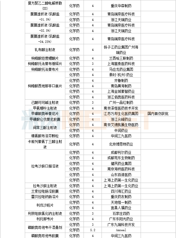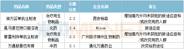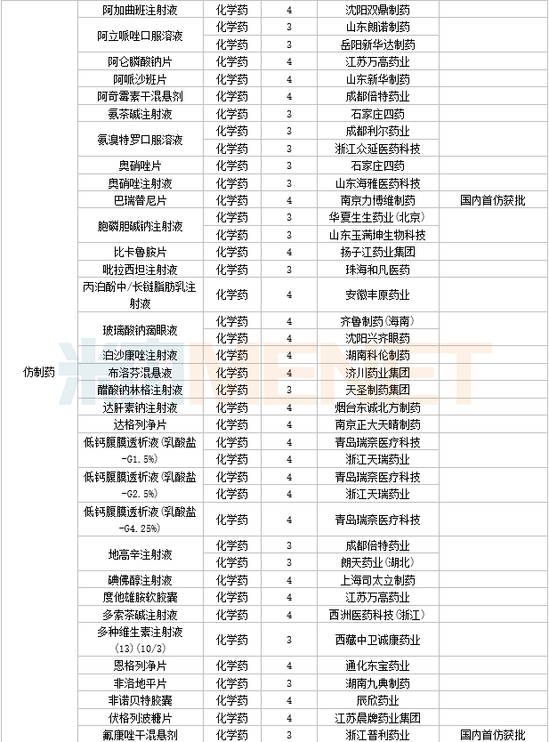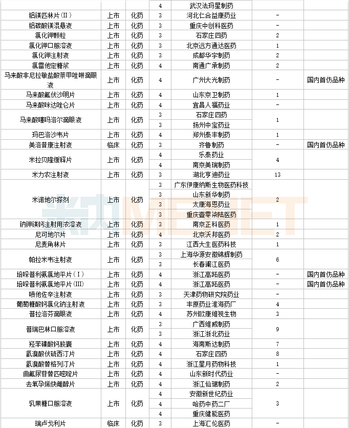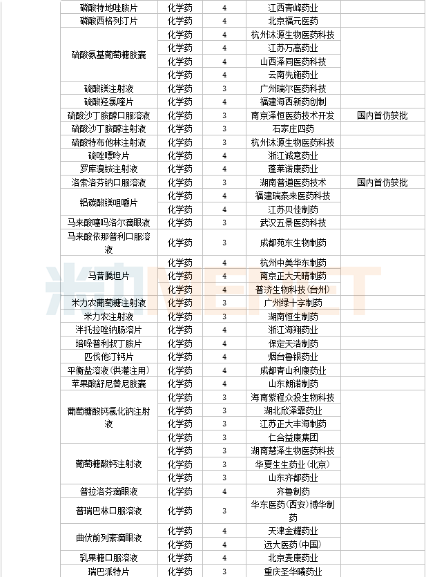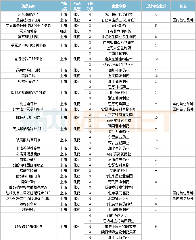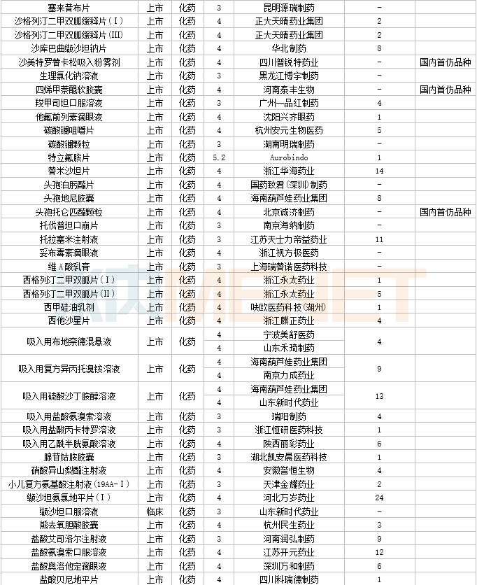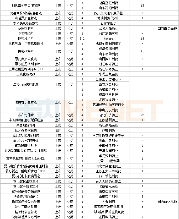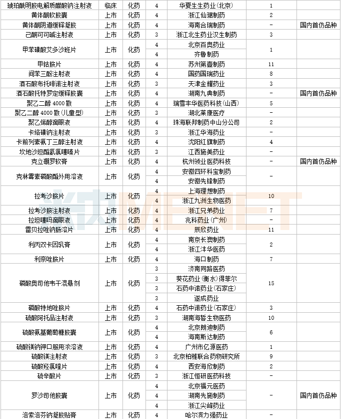 2个生物类似药获批:地舒单抗注射液(齐鲁制药)、注射用曲妥珠单抗(安徽安科生物工程(集团))。154个仿制药获批,巴瑞替尼片(南京力博维制药)、氟康唑干混悬剂(浙江普利药业)、甲磺酸奥希替尼片(江苏万邦生化医药集团)、硫酸沙丁胺醇口服溶液(南京泽恒医药技术开发)、洛索洛芬钠口服溶液(湖南普道医药技术)、棕榈酸帕利哌酮注射液(齐鲁制药)等6个品种为国内首仿品种。