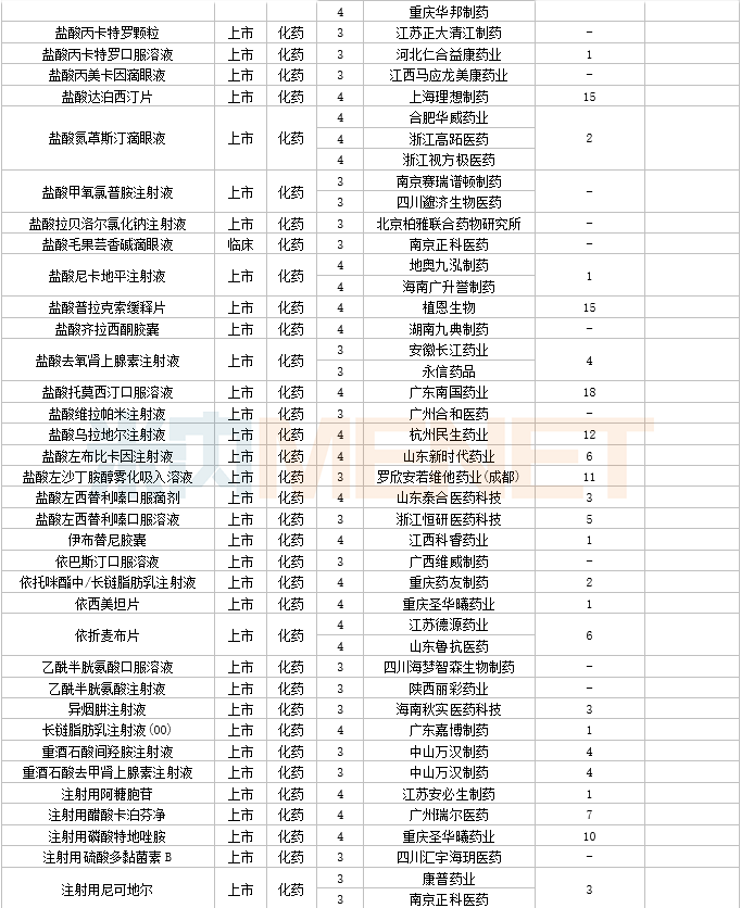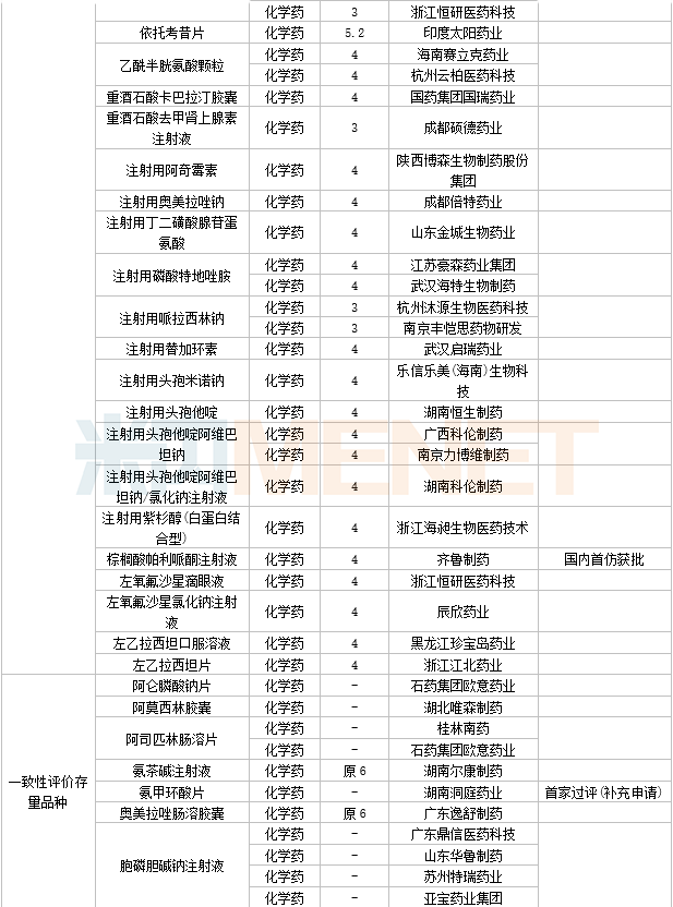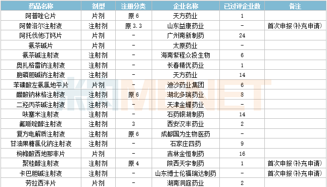 69个存量品种有企业过评,氨甲环酸片(湖南洞庭药业)、复方醋酸钠林格注射液(江苏正大丰海制药)、克拉霉素分散片(四川省旺林堂药业)、硫酸奈替米星注射液(江苏四环生物制药)、氯氮平分散片(寿光富康制药)、注射用氯诺昔康(苏州天马医药集团天吉生物制药)等6个品种为首家过评。