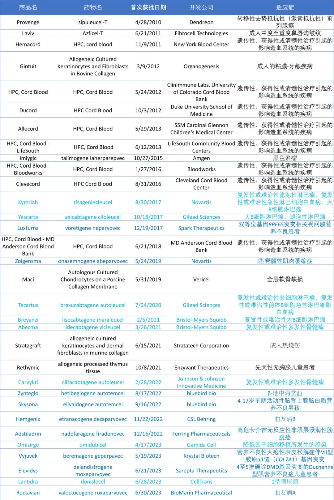 ▲截止至2023年10月底,获FDA组织和先进疗法办公室批准的32款疗法,包含9款基因(深蓝)与8款细胞(浅蓝)疗法(图片来源:药明康德内容团队根据公开资料整理制表)