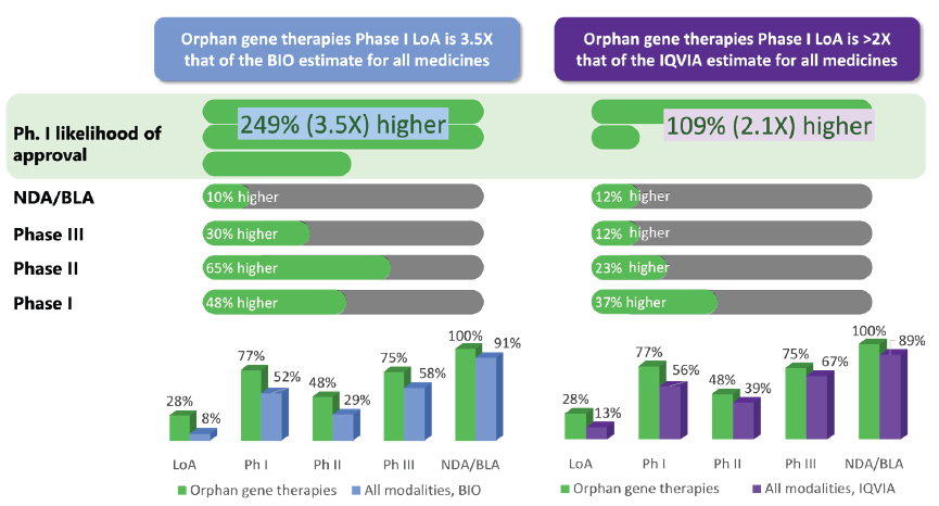 根据分析,孤儿基因疗法(27.6% LoA)在进入1期临床试验后获得批准的可能性是一般药物(BIO:7.9% LoA,IQVIA:13.2% LoA)的2至3.5倍,且孤儿基因疗法在每个临床开发阶段都有更好的成功率。
