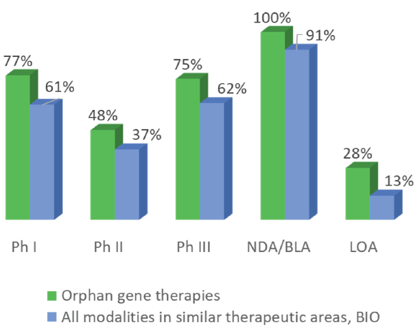 ▲与在类似领域的一般药物相较,孤儿基因疗法在进入1期临床后的获批成功率仍较高(图片来源:参考资料[1])