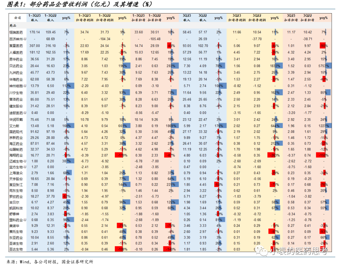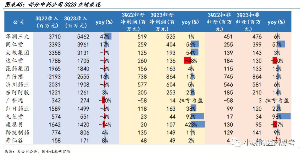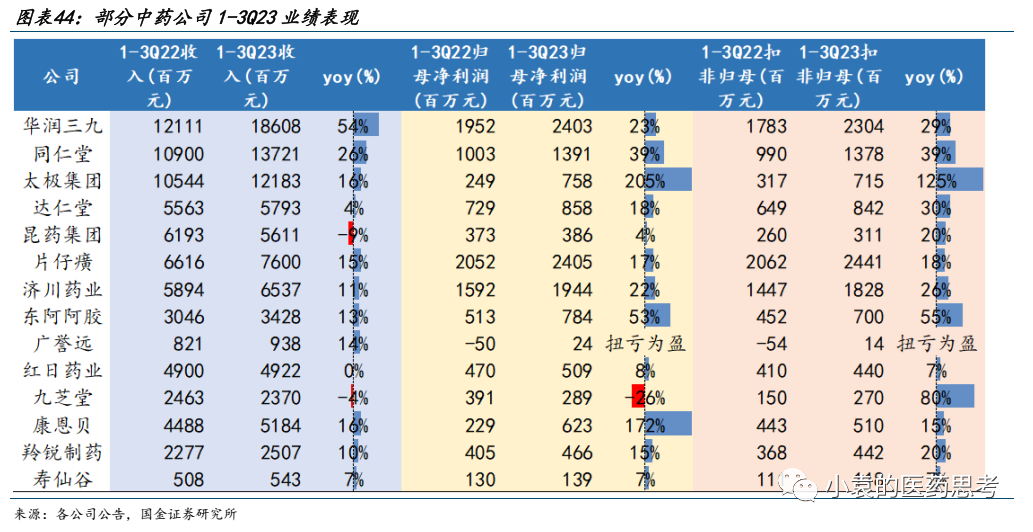 重点公司方面,品牌中药、消费中药公司增长良好。华润三九收入增速高于归母净利润,主要是由于昆药收购并表因素影响,公司整体经营稳中向好。太极集团国企改革初见成效,且藿香正气口服液和急支糖浆均实现高增长,公司2023前三季度实现了归母净利润同比增长205%。部分公司院内渠道收入占比较高,而三季度院内产品收到行业监管影响较大,导致企业Q3业绩表现不佳。