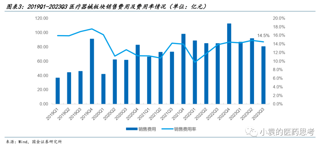 2023年Q3医疗器械板块销售费用率达到14.5%,环比-0.3pct。自2020年开始医疗器械板块销售费用受到带量采购和院内诊疗需求波动等因素影响出现下降,自2022年开始已出现明显恢复,近几个季度整体销售费用投入率保持相对稳定。