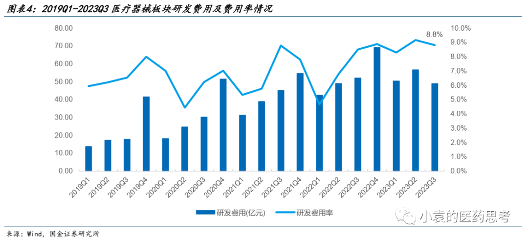 随着国家多项鼓励科技创新政策出台并实施,医疗器械创新发展呈加速之势,医疗器械生产企业创新研发内在的动力大大增强,创新医疗器械产品将加速涌现。国内上市公司研发投入占收入比例正在逐步接近跨国医疗器械公司水平。