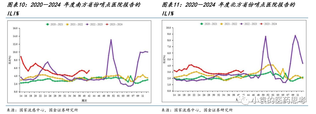 根据中疾控流感周报,2023年第42周(2023年10月16日-2023年10月22日),南方省份哨点医院报告的ILI%为5.4%,高于前一周水平(4.7%),高于2020~2022年同期水平(3.1%、3.0%和3.1%),北方省份哨点医院报告的ILI%为3.2%,高于前一周水平(2.9%),高于2020~2022年同期水平(2.2%、2.3%和2.8%)。近期流感样病例比例持续高于历年同期,建议持续关注流感疫情边际变化。